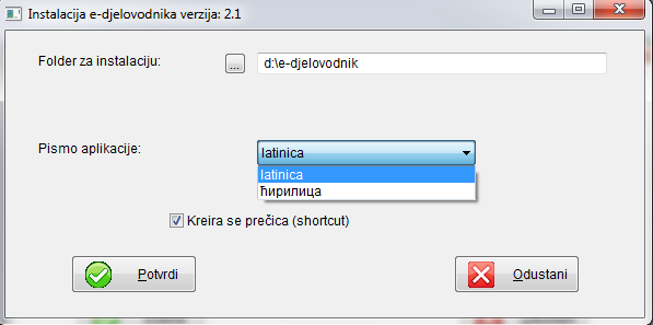 Popunjava se polje za folder gdje će biti kopirane datoteke za rad s programom, izabira se pismo aplikacije i potvrđuje da li se kreira prečica (shortcut) na radnoj površini. Na kraju se klikom na dugme Potvrdi startuju završne procedure instalacije. Nakon uspješne instalacije, javlja se dijalog s porukom: