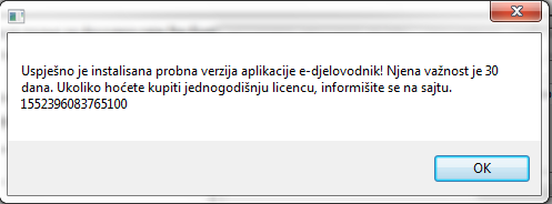 Instalirana je probna (trial) verzija aplikacije. Njena važnost je 30 dana, nakon toga se više ne startuje. Ako korisnik želi kupiti licencu za jednu godinu, podaci se mogu dobiti na sajtu www.e-djelovodnik.com/index.php/bs. Pri startu probne verzije, korisnik dobija poruku o njenom privremenom trajanju.